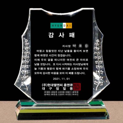 현대엘앤씨 홈앤큐 감사패 교회상패 제작 크리스탈기념패 퇴직선물